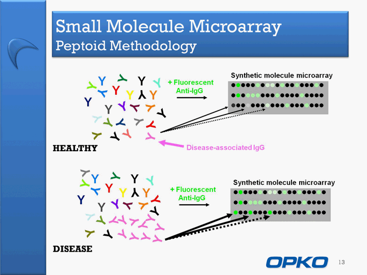 | Molecular Diagnostics Small Molecule Microarray Molecular microarray technology acquired June 17, 2009"Peptoids" as first example of small molecule array to detect disease- associated antibodiesBroad application for diagnosing diseases by a simple blood testNeurological disorders (Alzheimers Disease)Cancers (Lung Cancer)Other Diseases 12 |