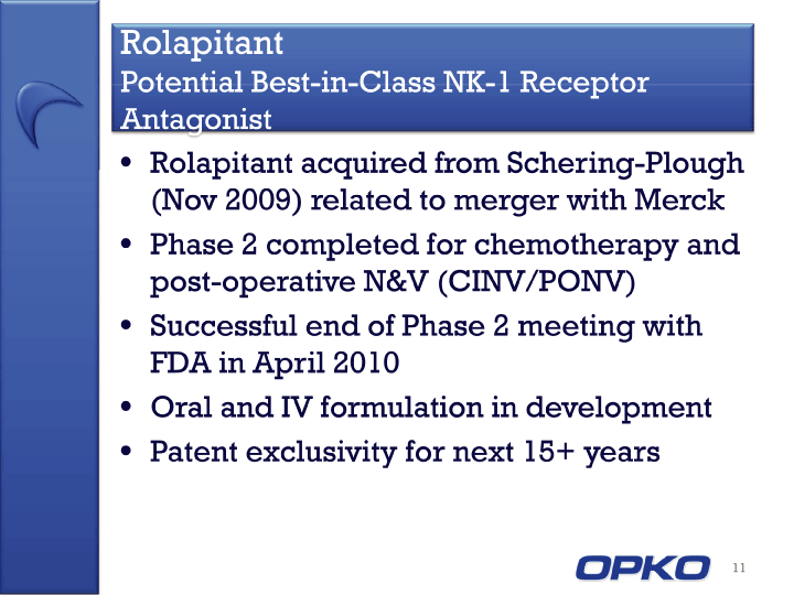 | New Products & Technologies Acquired rolapitant and other NK-1 assets from Schering Plough. Phase II clinical testing completed for prevention of chemotherapy induced and post-operative induced nausea and vomiting. Company intends to pursue development for both indications 4 |